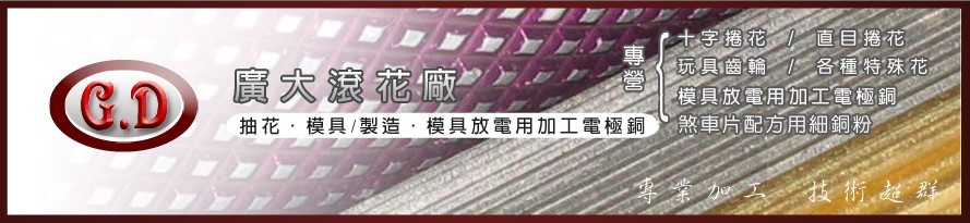 產品項目: 專營各式材質(銅、鋁、塑鋼、12L14鐵、 1215鐵、白鐵)滾花 。 模具產品:齒輪模具、直花模具、鑽石花模具、客製特殊花模具設計 。 放電加工用直花、鑽石花、特殊花電極紅銅棒 。 煞車片配方用細銅粉 。